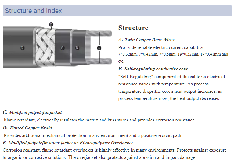 Quick Heating Self Limiting Heating Cable has become the most common type of electric tracing in the world. They can be widely used in liquid transportation in pipelines and tank anti-freeze insulation, maintain process temperature, heating highways, ramps, crosswalks, eaves and floors. A semiconductor polymer material is distributed between the two conductive cores of self-limiting electric tracing, and the outer part is composed of a polymer inner sheath, an alloy shielding net and a polymer outer sheath. When there is a current through the cable, the cable resistance increases as the temperature of the electrical wake increases. The result is that the output power of the electric wake decreases with the increase of its temperature. Since the heat tracing power varies with the temperature at various points in the electrical wake, the heated semiconductor core material behaves as a variable temperature resistance contrary to the trend of high/low heating temperature. Self-limiting electric wake will not overheat even if overlapped. No special design is required. The self-limiting electric tracing cable can be cut at any time in the field to exactly correspond to the actual laying length of the pipeline. Quick Heating Self Limiting Heating Cable structure 1. Copper conductor :7×0.50, 19×0.32, 19×0.41 2. Conductive plastic layer: ordinary PTC, flame retardant PTC, fluorine-containing PTC 3. Insulation layer: modified benign polyolefin, flame retardant polyolefin, fluorinated polyolefin, perfluorinated materials 4. Shielding layer: tin-plated soft round copper wire, covering 80% density 5. Jacket layer: modified benign polyolefin, flame retardant polyolefin, fluorinated polyolefin, perfluorinated materials 3. Construction temperature: minimum: -5℃ 4. Thermal stability: after 300 cycles from 15℃ to 99℃, the cable heat value remains above 90%. 5. Bending radius: 25.4mm-30mm at room temperature of 20℃ and 35.0mm at low temperature 6, insulation resistance: cable length of 100 m, the environment temperature 75 ℃, with 2500 VDC wave table 1 minute, the insulation resistance (wire) between the block and the minimum is 120 m Ω. 7. Starting current (10℃) 0.4a per meter